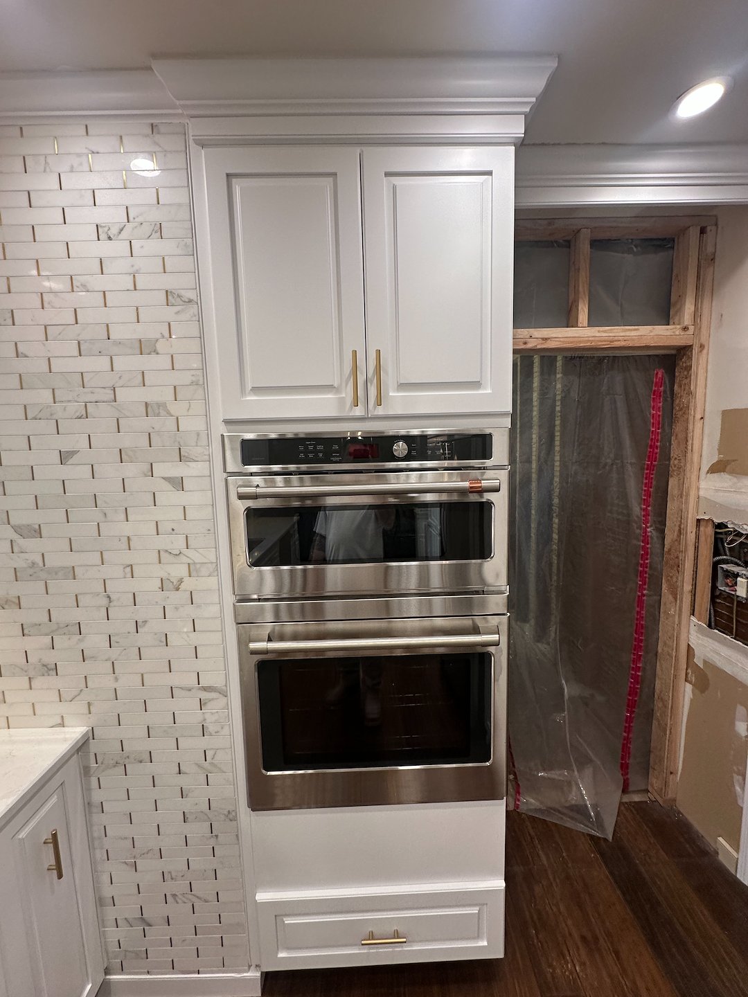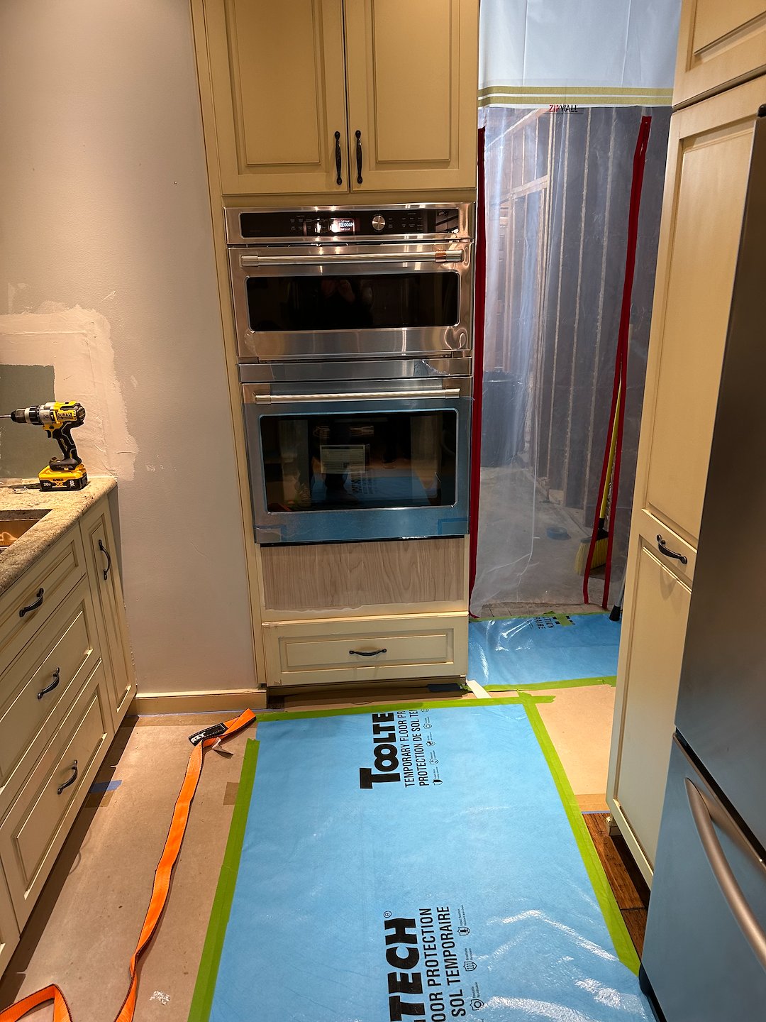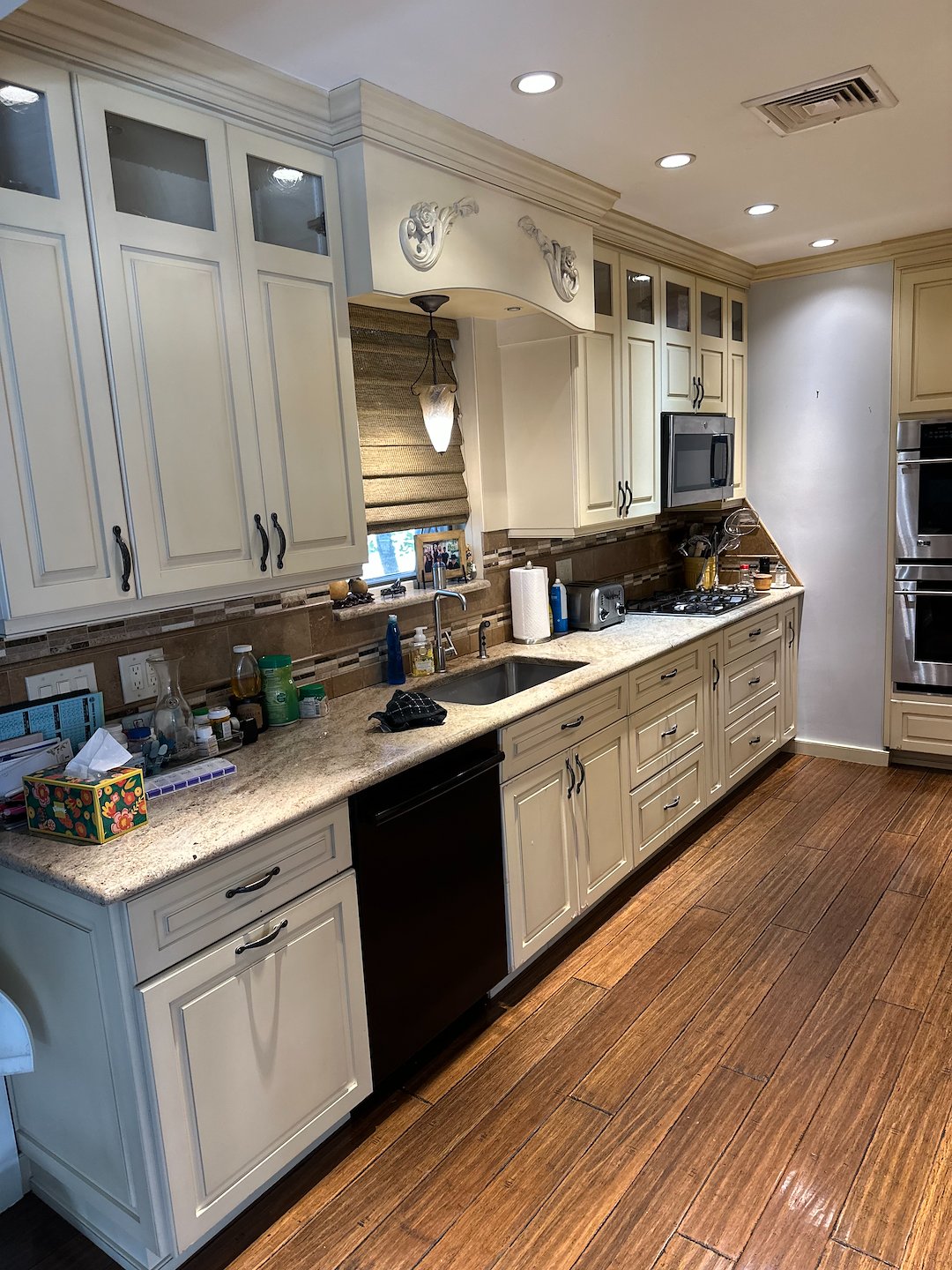 GSG Custom Coatings documented a kitchen cabinet refinishing project in Westwood, NJ. The homeowner wanted the cabinets restored to their original beauty, so the team began with a careful and methodical approach.