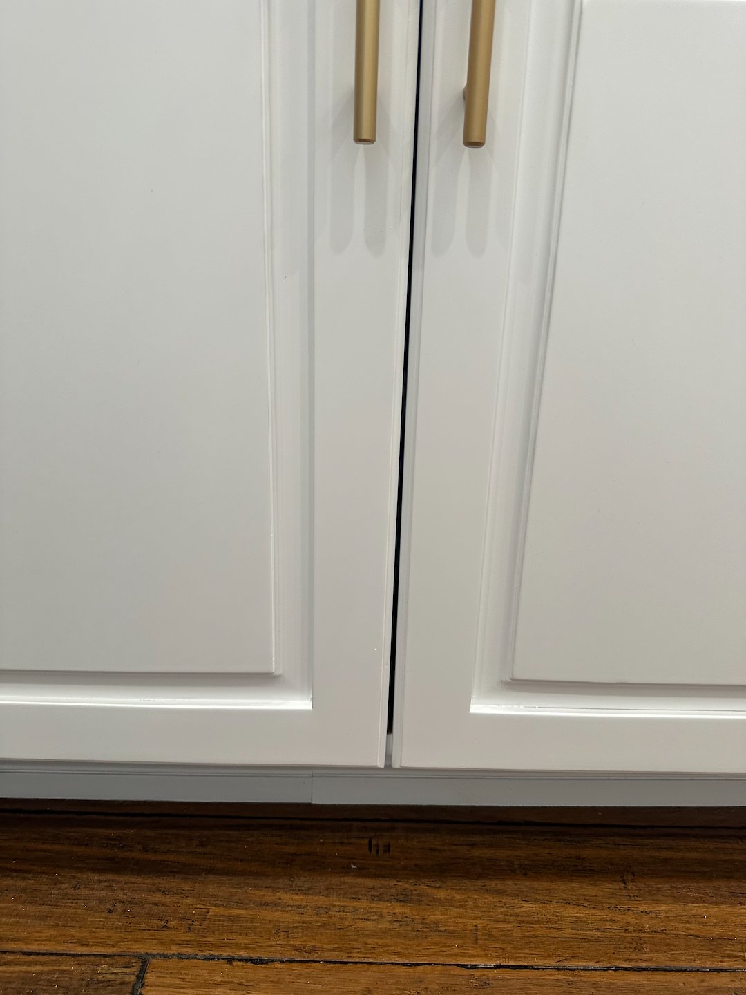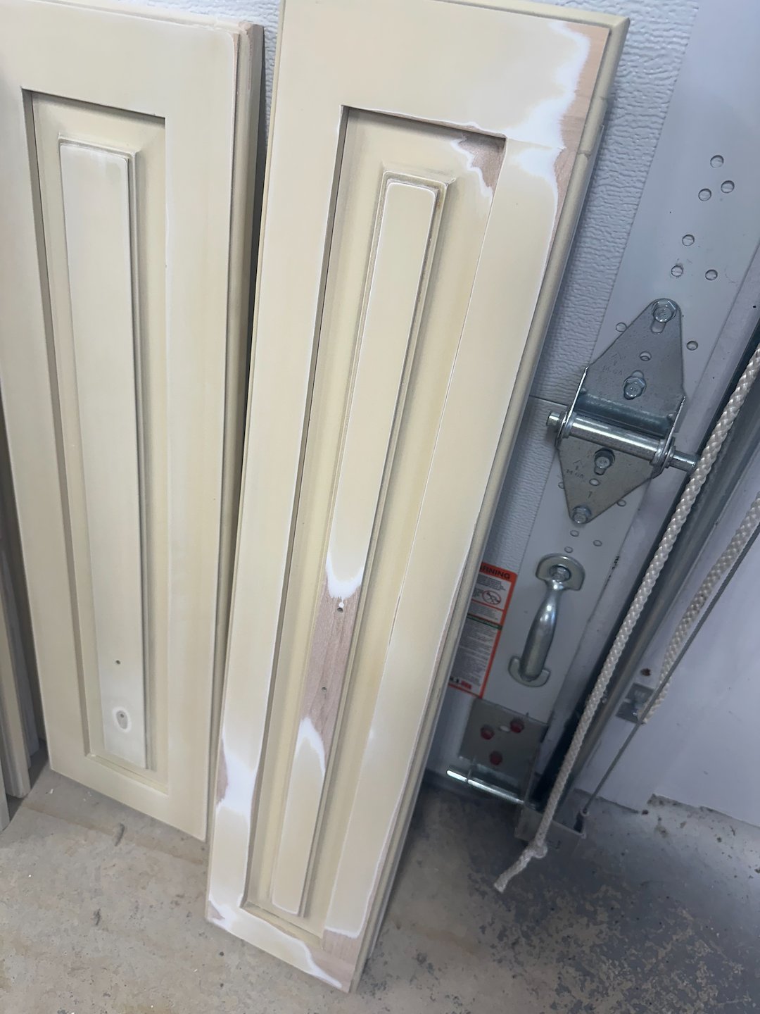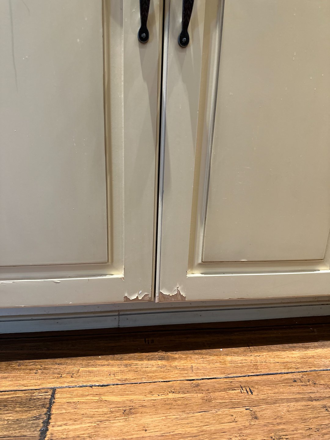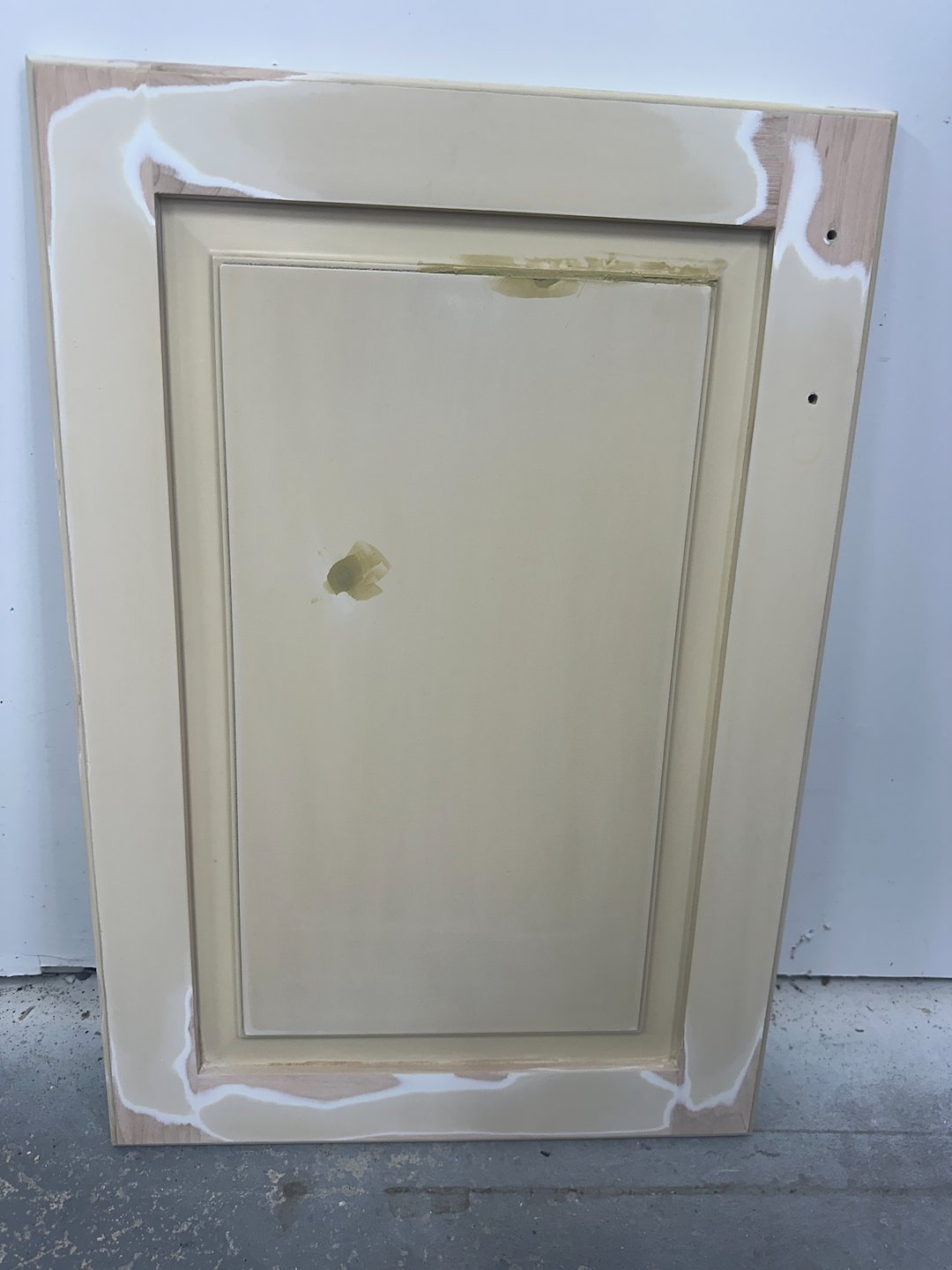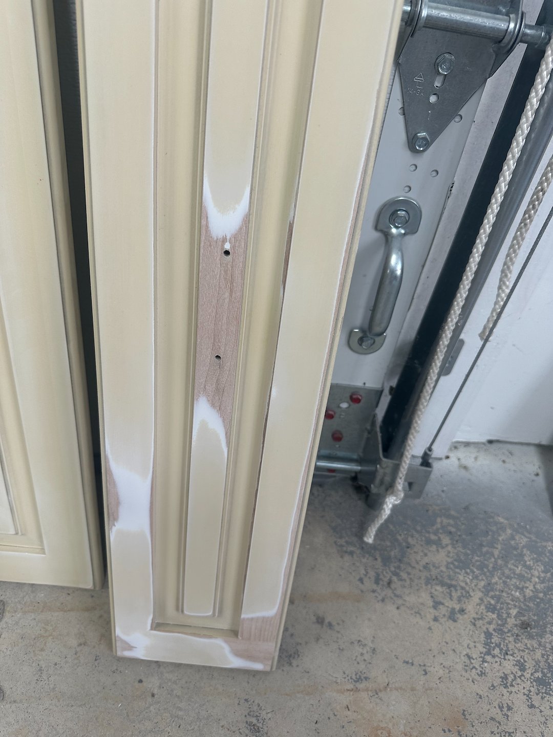 Wood filler was applied next to repair dents, cracks, and scratches. This step restored the physical integrity and appearance of the doors and drawer fronts, ensuring small imperfections would not show through the final finish.
