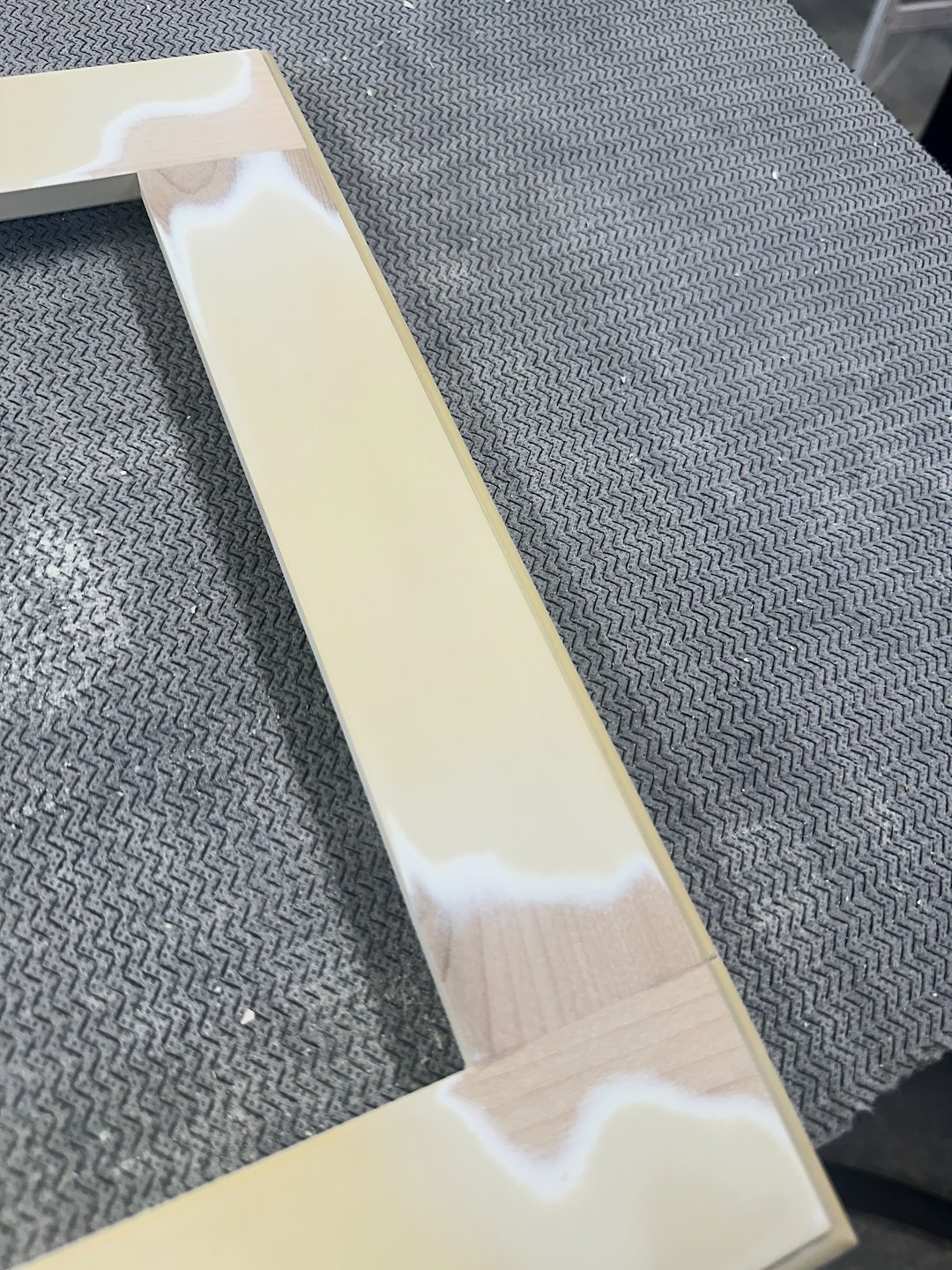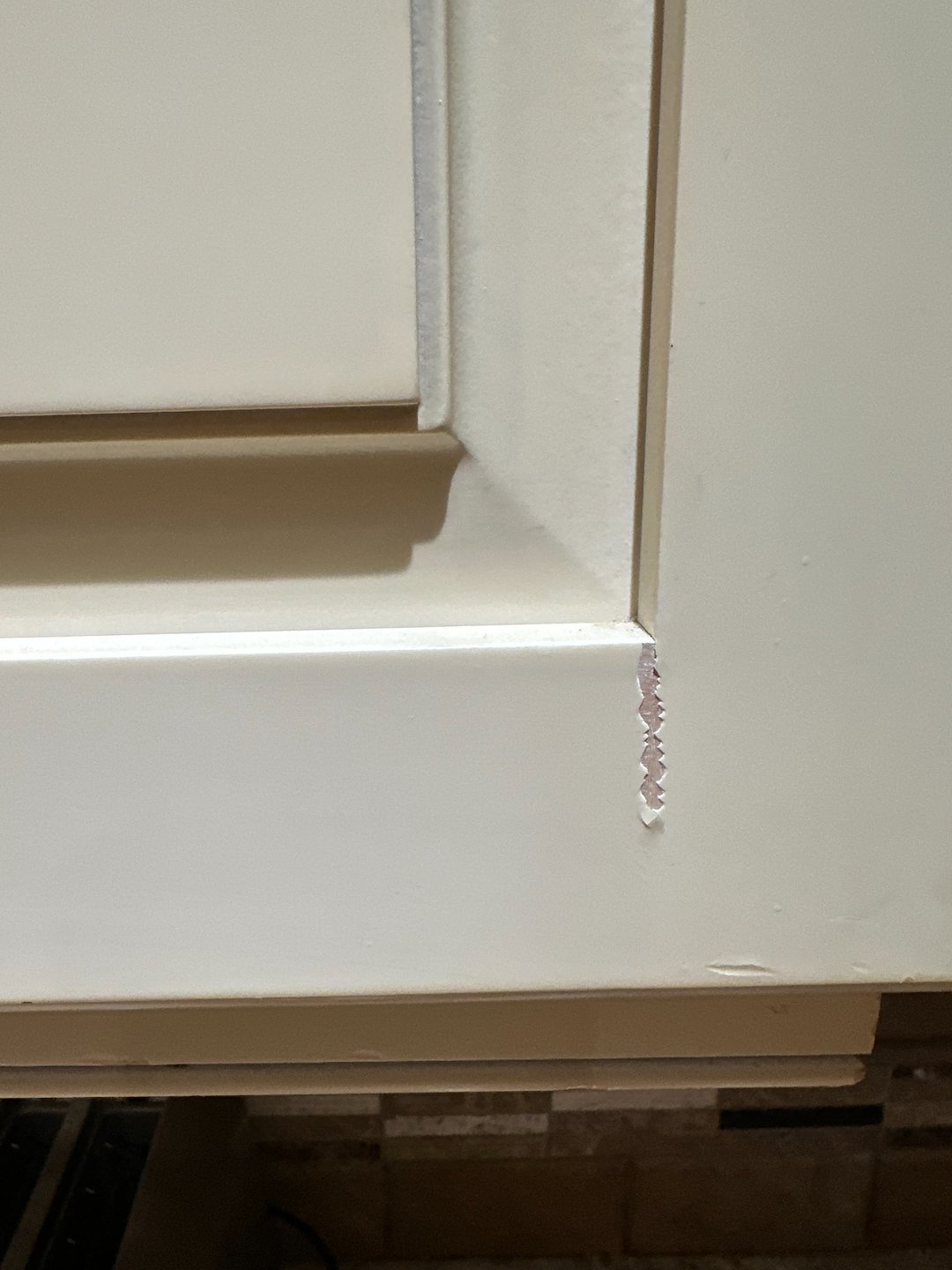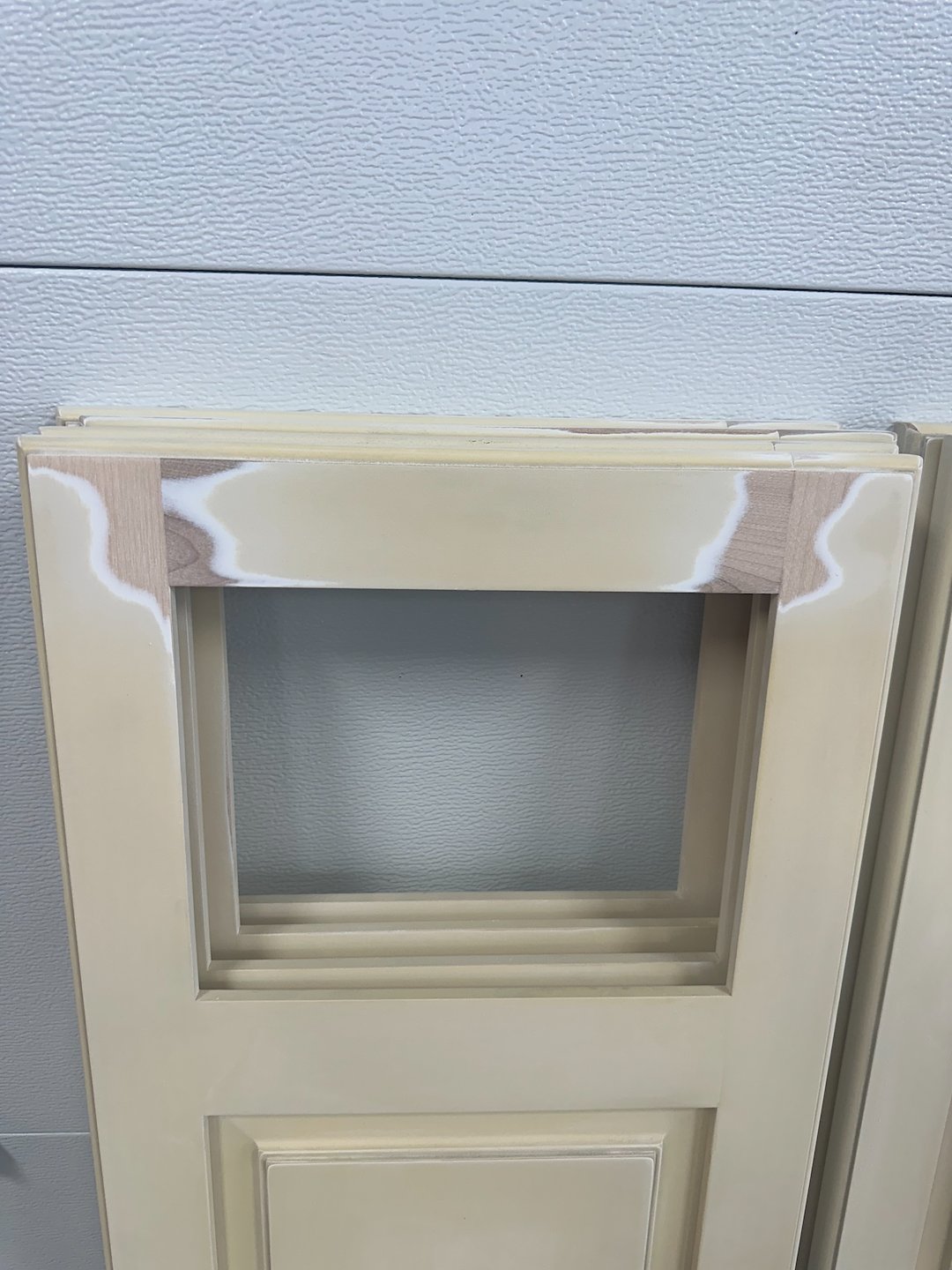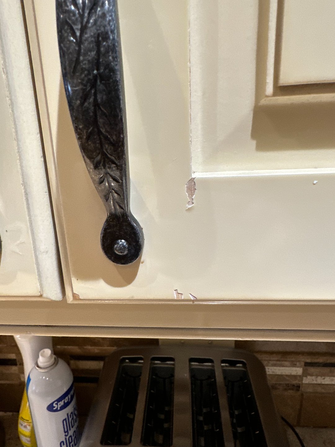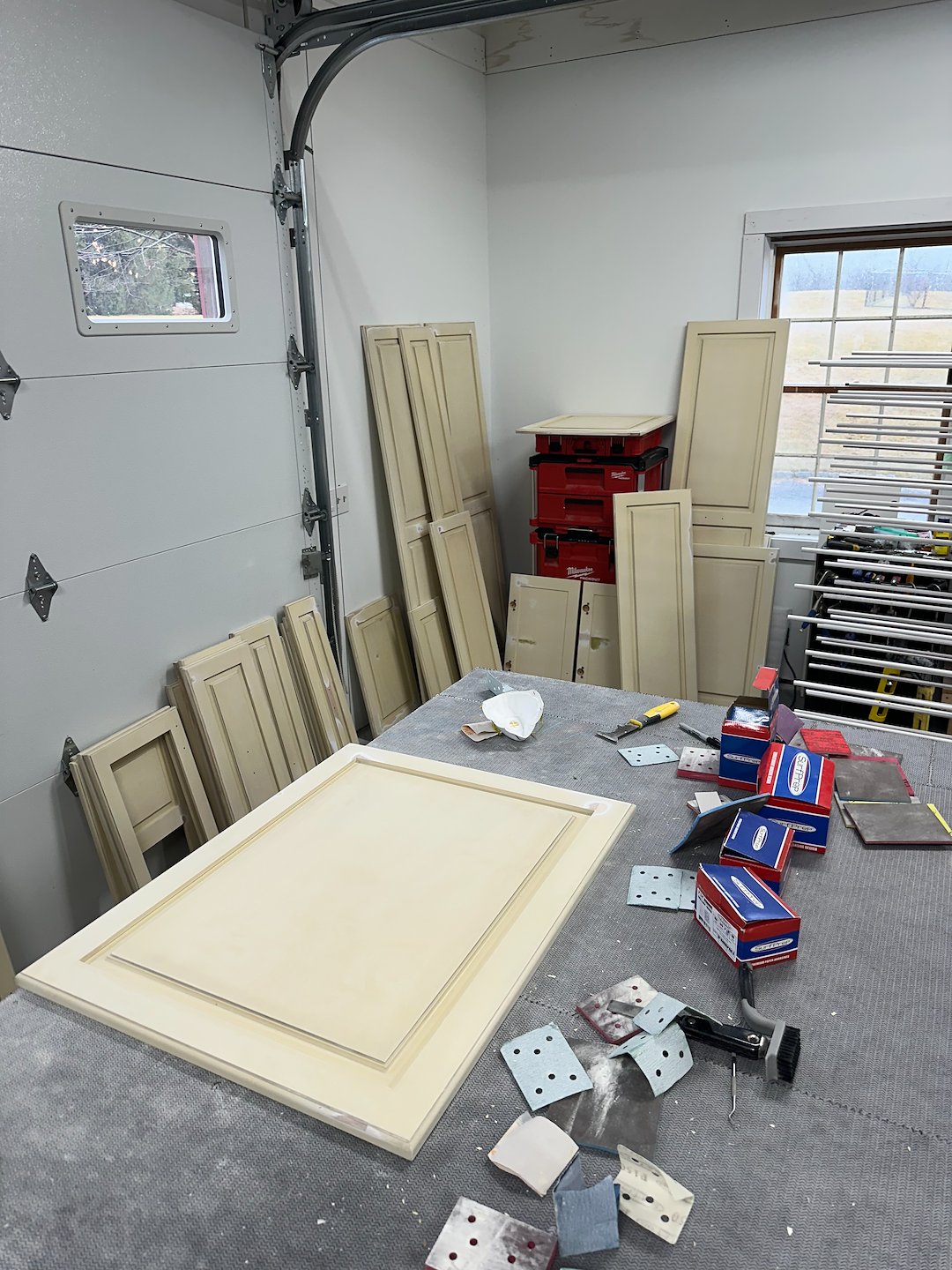 Wood filler was applied next to repair dents, cracks, and scratches. This step restored the physical integrity and appearance of the doors and drawer fronts, ensuring small imperfections would not show through the final finish.